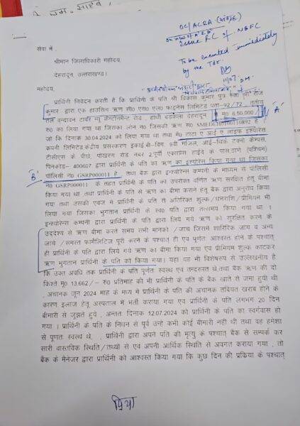 जिलाधिकारी सविन बंसल के समक्ष 11 जुलाई 2025 को बैंक ऋण से जुड़ा एक प्रकरण आया जिसमें फरियादि प्रिया ने डीएम को बताया कि उनके पति स्व0 विकास कुमार द्वारा 6.50 लाख का बैंक से ऋण लिया था तथा बैंक के अनुरोध पर ऋण का भी बीमा भी करवाया था। बीमा कम्पनी द्वारा ऋण का बीमा करते समय सभी मानकों /जांच जिसमें शारीरिक तथा अन्य समस्त जांच की औपचारिकताएं पूर्ण करते हुए ऋण का बीमा किया गया तथा प्रीमियम शुल्क काटते हुए ऋण भुगतान उनके पति को किया गया। उनके पति की मृत्यु 12 जुलाई 2024 को आकस्मिक मृत्यु हो गई थी।