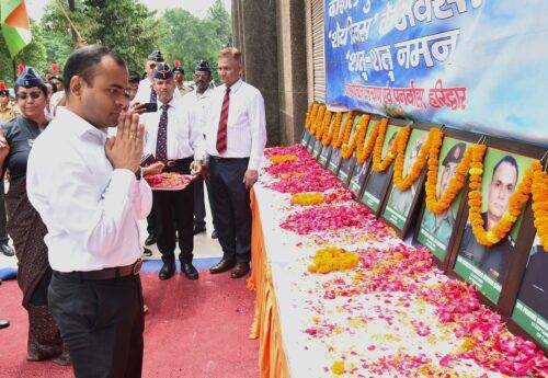 जिलाधिकारी ने कारगिल शहीद एवं शहीद सैनिकों के चित्र पर श्रद्धासुमन अर्पित करते हुए शहीदों को नमन किया तथा शहीदों के याद में 2 मिनिट का मौन रख कर गार्ड ऑफ ऑनर दिया गया।