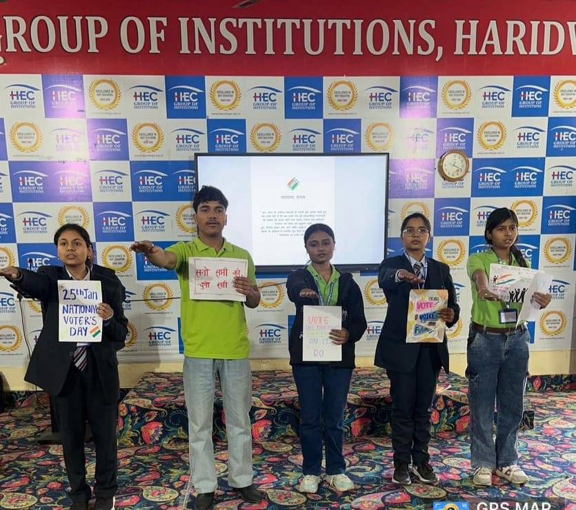 एचईसी ग्रुप ऑफ इंस्टीट्यूशन्स, हरिद्वार में ‘राष्ट्र्ीय मतदाता दिवस‘ मनाया गया। संस्थान के सोशल क्लब ने ‘मेरा भारत-मेरा वोट‘ विषय पर एक रोचक कार्यक्रम का आयोजन किया जिसकी थीम थी ‘भारतीय लोकतंत्र के केन्द्र में भारतीय नागरिक‘। छात्रों ने मतदान के महत्व और जिम्मेदार नागरिकता पर एक नुक्कड नाटिका प्रस्तुत की जिसमें पवन, ज्योति, अर्चिता, सृष्टि, पावनी, श्रुति, कामाक्षी, मनीषा, प्राची एवं कनिष्का आदि छात्राओं ने प्रतिभाग किया। सभी छात्रों ने लोकतांत्रिक मुल्यों को बनाए रखने की शपथ ली।