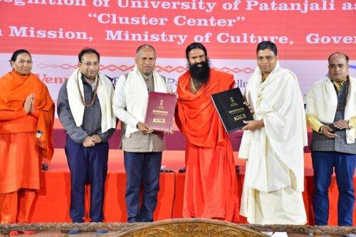 हरिद्वार, 14 दिसम्बर। ज्ञान भारतम मिशन, संस्कृति मंत्रालय के द्वारा आज हरिद्वार में आयोजित एक समारोह में पतंजलि विश्वविद्यालय को “क्लस्टर सेंटर” के रूप में मान्यता प्रदान की गई। इस संदर्भ में पतंजलि विश्वविद्यालय के कुलाधिपति योगगुरु स्वामी रामदेव, कुलगुरु डॉ. आचार्य बालकृष्ण तथा ज्ञान भारतम मिशन के प्रोजेक्ट डायरेक्टर डॉ. अनिर्बान दाश, डॉ. श्रीधर बारीक (कॉर्डिनेटर, NMM) तथा श्री विश्वरंजन मालिक (कॉर्डिनेटर, डिजिटाइजेशन, NMM) की उपस्थिति में एक MoU साइन किया गया।
