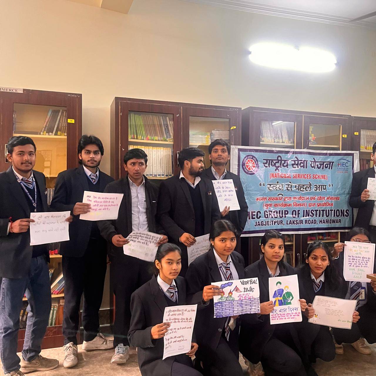 दिनांक. 26.12.202. हरिद्वार एचईसी ग्रुप ऑफ इंस्टीट्यूशन्स, हरिद्वार में ‘वीर बाल दिवस‘ के अवसर पर छात्रों के समग्र विकास को ध्यान में रखते हुए ‘स्लोगन लेखन‘ व प्रेरक खेल गतिविधियों का आयोजन किया गया। इस आयोजन का उद्देश्य छात्रों में समय प्रबंधन, निरन्तरता, टीम वर्क तथा जीवन की बाधाओं को सकारात्मक दृष्टि से पार करने की समझ और राष्ट्र् भावना को विकसित करना था। छात्रों ने वीरता, अनुशासन, और राष्ट्र्वाद पर स्लोगन लिखे, साथ ही उन्होंने सीखा की सीमित समय और साधनों में निरंतर प्रयास सही योजना और धैर्य से लक्ष्य प्राप्त किया जा सकता है।