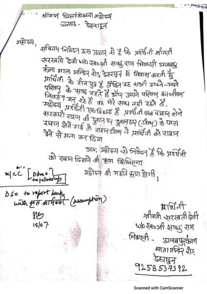 देहरादून दिनांक16 जुलाई 2025( सू वि), जिलाधिकारी सविन बंसल के सम्मुख 15 जुलाई को अजबपुर निवासी एक 72 वर्षीय बुजुर्ग महिला सरस्वती देवी ने अपनी गुहार लगाई कि पूर्ति विभाग उनका राशन देने में आनाकानी कर रहा है। बुजुर्ग सरस्वती ने जिलाधिकारी को बताया कि उनके 3 पुत्र हैं जो सभी अपने-अपने परिवार संग अलग-अलग रहते हैं। वह अपना गुजारा अपनी विधवा पेंशन से चलाती हैं। उन्होंने डीएम को बताया कि राशन डीलर पूर्ति विभाग की सूची में नाम न होने का कारण बताकर राशन नहीं दे रहा है, जबकि पूर्व में उसे राशन मिलता था। उसने डीएम से राशन दिलाने की गुहार लगाई। जिस पर डीएम ने पूर्ति अधिकारी को तलब करते हुए तत्काल वस्तुस्थिति से अवगत कराने तथा महिला को राशन दिलाने के निर्देश दिए। जिलाधिकारी तक मामला पहुंचते ही पूर्ति विभाग के अधिकारी/ कार्मिकों के हाथ पांव फूल गए, कलेक्टेªट की कलम चलने से पहले ही पूर्ति विभाग के अधिकारी/कार्मिक दौड़े-दौड़े बुजुर्ग महिला तक पहुंचे तथा बजुर्ग महिला का राशन कार्ड बहाल करते हुए उसी दिन 15 जुलाई को ही उनके कोटे का खाद्यान्न दिलाया। वहीं डीएम की सख्त चेतावनी है कि बुजुर्ग, महिला, बच्चों, असहाय का शोषण तिरस्कार होगा दण्डनीय है, इस प्रकार के मामले क्षम्य नही होंगे।जिलाधिकारी अपने कार्यालय कक्ष में प्रतिदिन जनमानस की समस्याएं सुनते हैं तथा उनका निस्तारण हेतु संबंधित विभागों के अधिकारियों को निर्देशित करते हैं। जिलाधिकारी प्राप्त होने वाली शिकायतों की स्वयं मॉनिटरिंग कर रहे हैं तथा उनके निस्तारण आख्या संबंधित विभागों के अधिकारियों से प्रतिदिन प्राप्त की जाती हैं।
